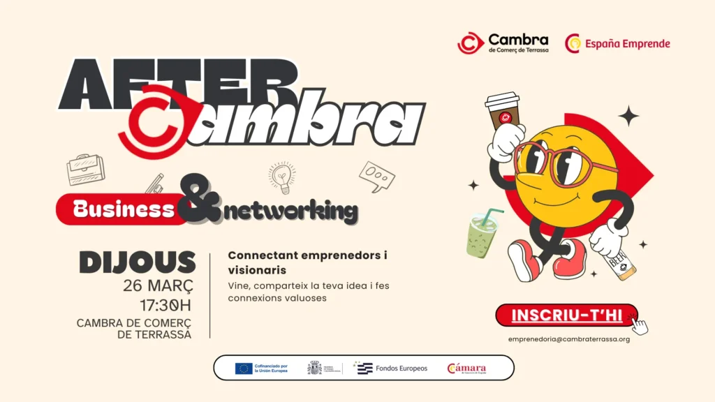 L’Afterwork de la Cambra de Comerç de Terrassa és l’espai ideal per connectar amb altres emprenedors, autònoms i professionals del territori en un ambient distès, inspirador i col·laboratiu. Una trobada pensada per compartir experiències, generar sinergies i descobrir noves oportunitats en clau local.