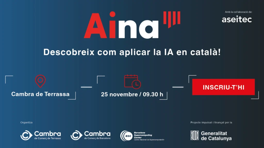 Des de la Cambra de Comerç de Terrassa, amb l’impuls de la Secretaria de Polítiques Digitals de la Generalitat de Catalunya i la col·laboració de BSC, organitzem una sessió per donar a conèixer les capacitats del projecte AINA.