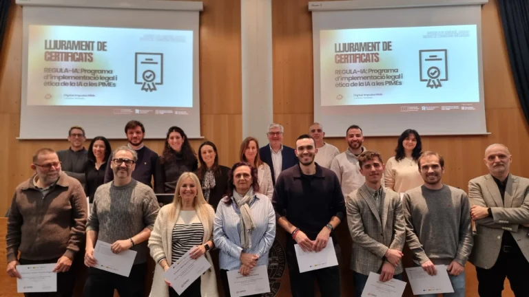 Terrassa, 20 de febrer de 2026.- La Cambra de Comerç de Terrassa lliurava ahir dijous les certificacions de la primera edició del programa REGULA-IA, d’implementació legal i ètica de la intel·ligència artificial (IA) adreçat a petites i mitjanes empreses. Es tracta d’un programa pioner a Catalunya que integra les perspectives tècnica, legal i ètica de la IA a l’entorn empresarial. La formació, en què han participat deu PIMEs catalanes, ha estat subvencionada al cent per cent per la convocatòria RETECH del Pla de Recuperació i Resiliència (PRTR) i els fons Next Generation EU. Ara la Cambra de Comerç de Terrassa replicarà aquest programa dins els serveis privats en el marc del Digital Impulse Hub – Cambra Terrassa.