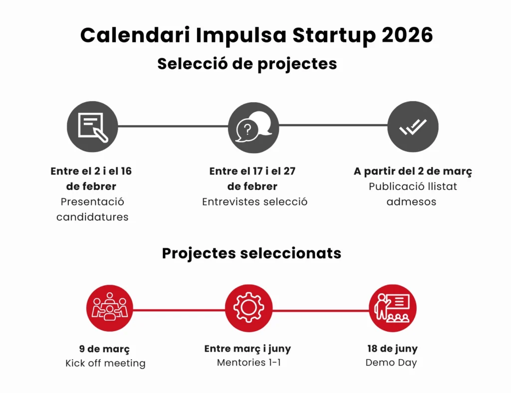 A través d’un itinerari pràctic i personalitzat, Impulsa Startup t’ofereix les eines, el coneixement i l’acompanyament necessari per validar el teu model de negoci, fer-lo créixer i connectar amb l’ecosistema emprenedor i inversor. Una oportunitat per impulsar el teu projecte i portar-lo al següent nivell.