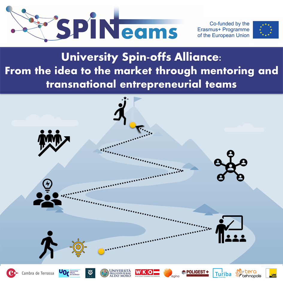 “SPINTeams” és un projecte de tres anys recolzat pel programa ERASMUS +. SPINTeams vol desenvolupar un ecosistema emprenedor a les universitats desenvolupant una formació completa d’emprenedoria, la figura de coach i creant un vincle amb a les comunitats empresarials d’èxit mitjançant una plataforma de col·laboració internacional a més d’establir metodologies d’assessorament, aprenentatge entre iguals i mentoria per tal d’augmentar la taxa d’èxit de les start-ups i spin-offs.